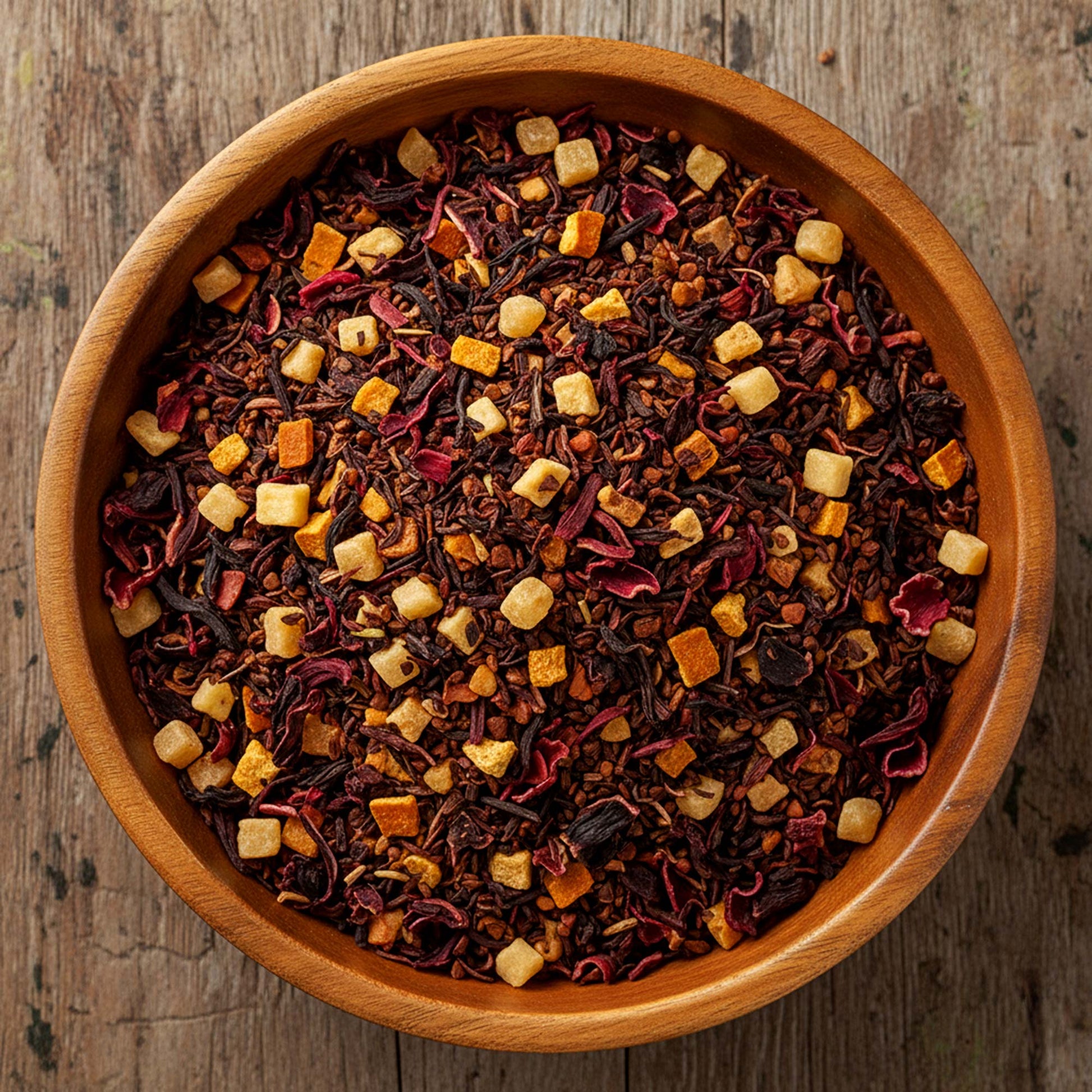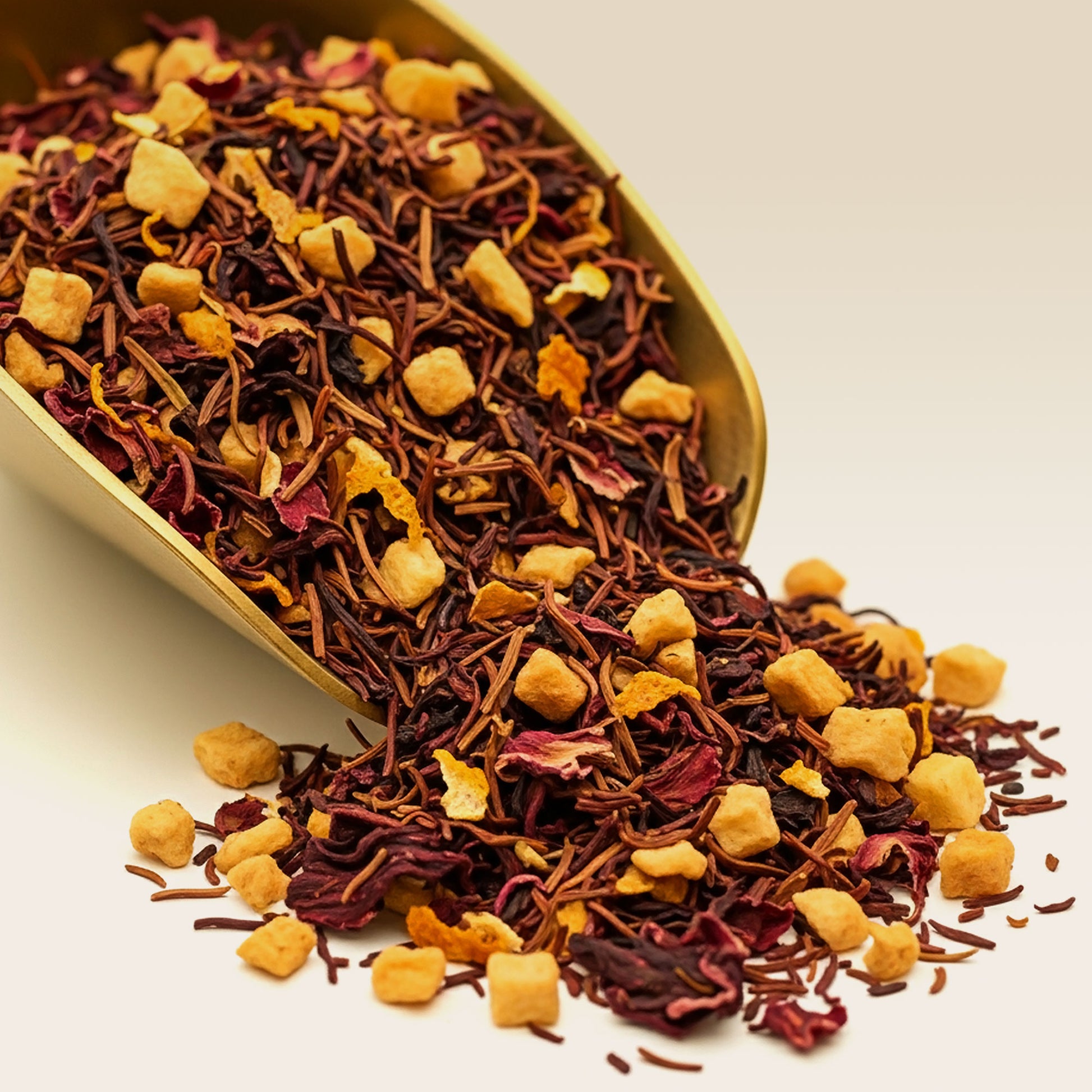 A sparkling fusion of crisp apple, juicy pineapple, and zesty orange peel over a naturally sweet honeybush base. Elderflower essence adds a delicate floral lift, creating a refreshing, effervescent blend reminiscent of a celebratory Bellini.