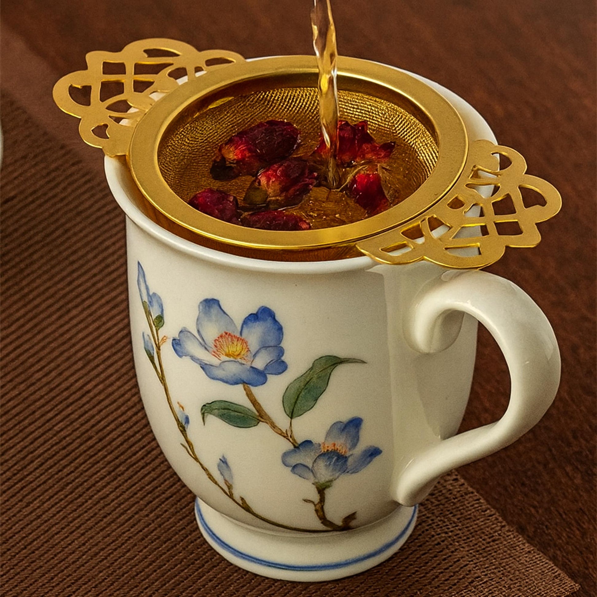 This stainless steel tea strainer blends functional design with refined elegance. The fine mesh ensures a clean, smooth pour, capturing even the smallest tea leaves. Its striking gold finish and decorative side handles make it as beautiful as it is practical. Designed to fit comfortably over teapots and cups, it’s an essential accessory for loose-leaf tea lovers who value both quality and style.