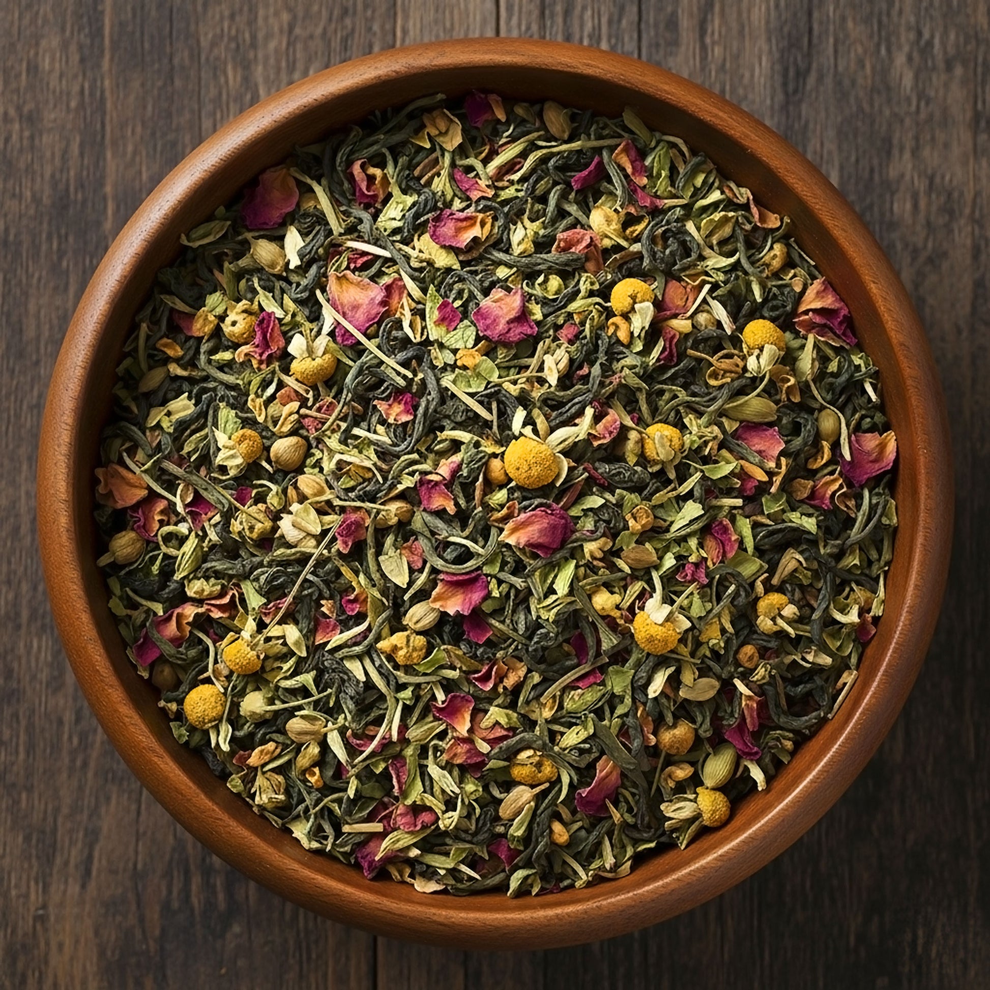A delicate, floral infusion that pairs smooth White Peony with fragrant rose, chamomile, and a hint of citrusy brightness. Enhanced with pure rose essential oil, this blend offers an exquisite, ethereal experience in every sip.