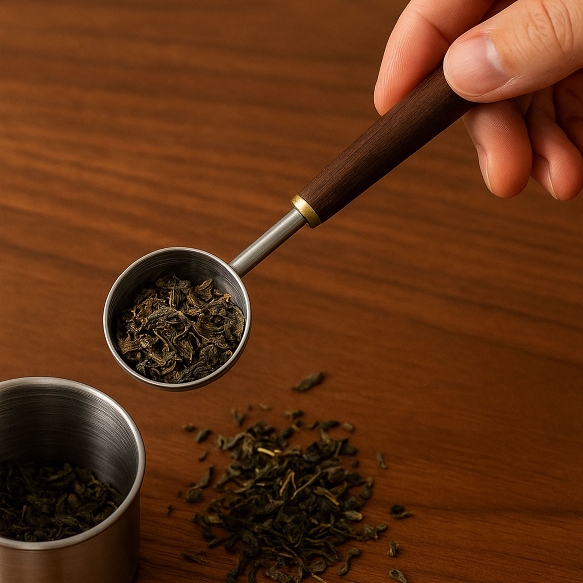 Crafted for tea lovers who value both form and function, this stainless steel scoop features a smooth, polished finish and a richly grained walnut handle. Its long reach makes it ideal for tins, jars and pouches, ensuring you get the perfect scoop every time. Perfect for home brewers and connoisseurs alike, this tea scoop adds a touch of elegance to your daily ritual.