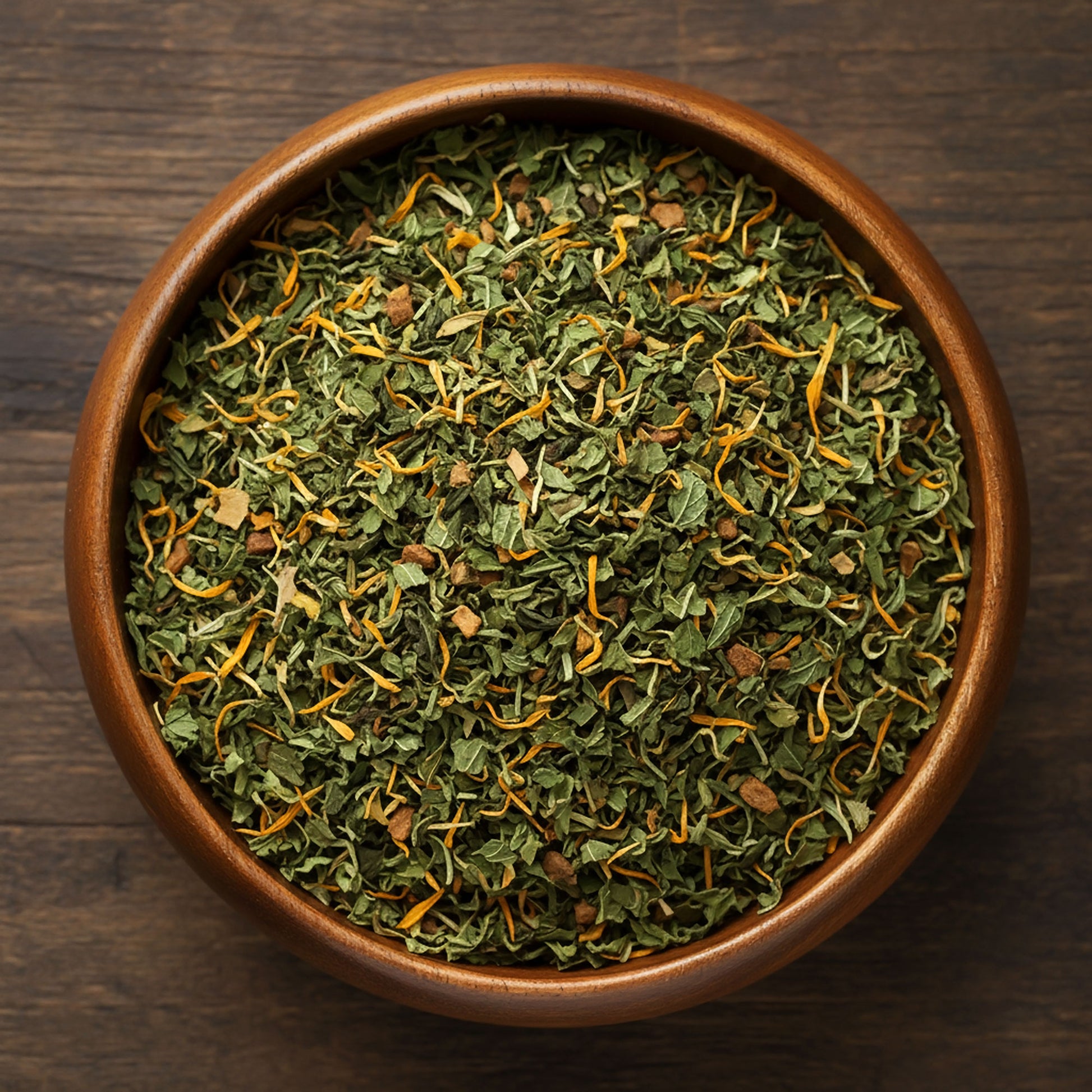 A refreshing herbal blend with nettle, dandelion root, peppermint, and lemon balm. Delicate calendula petals and lemon essential oil complete this naturally caffeine-free infusion with a bright, uplifting finish.