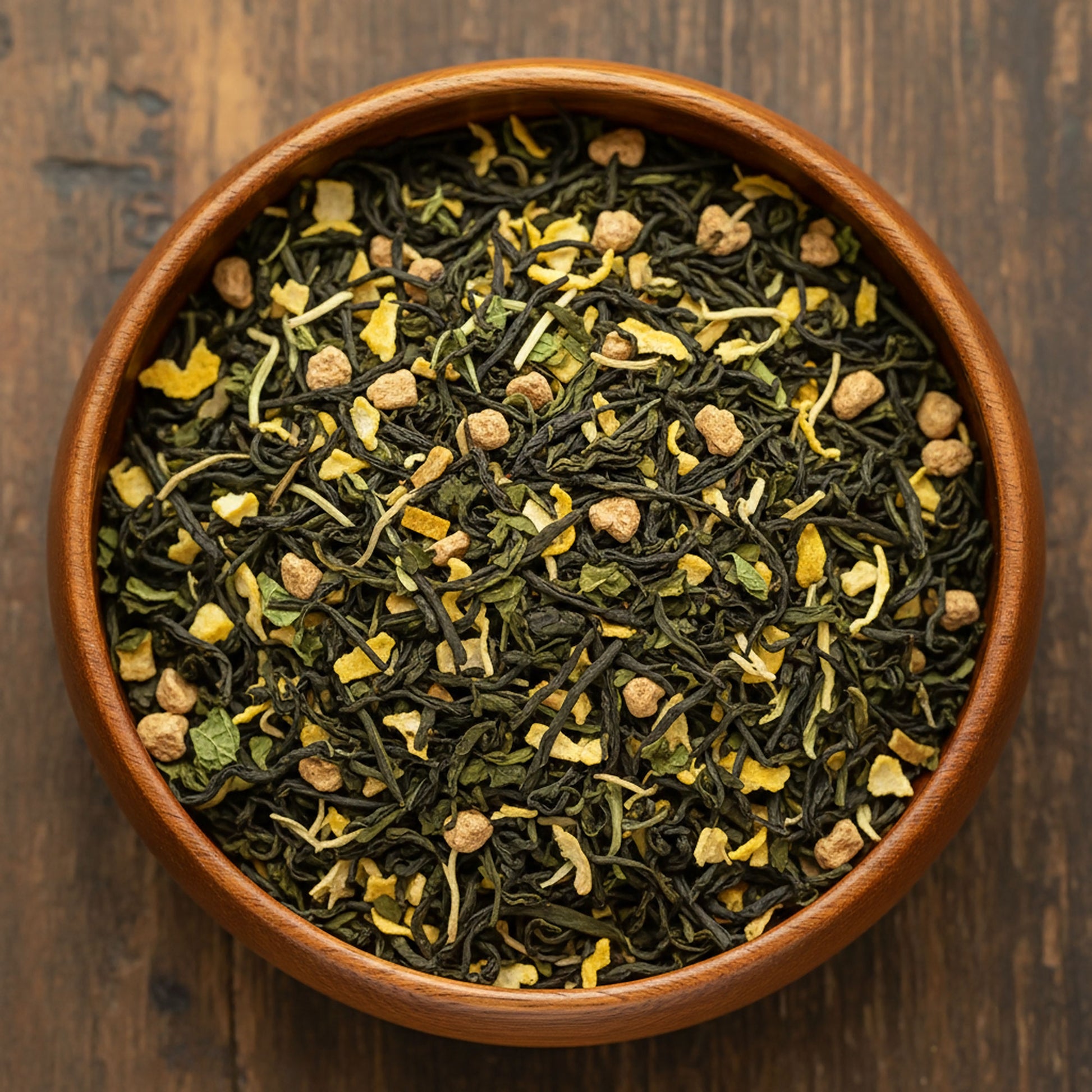 A vibrant green tea blend with citrus and herbal layers. Sencha, ginseng, lemon balm, and peppermint combine to create a naturally refreshing, crisp infusion with a clean, bright finish.
