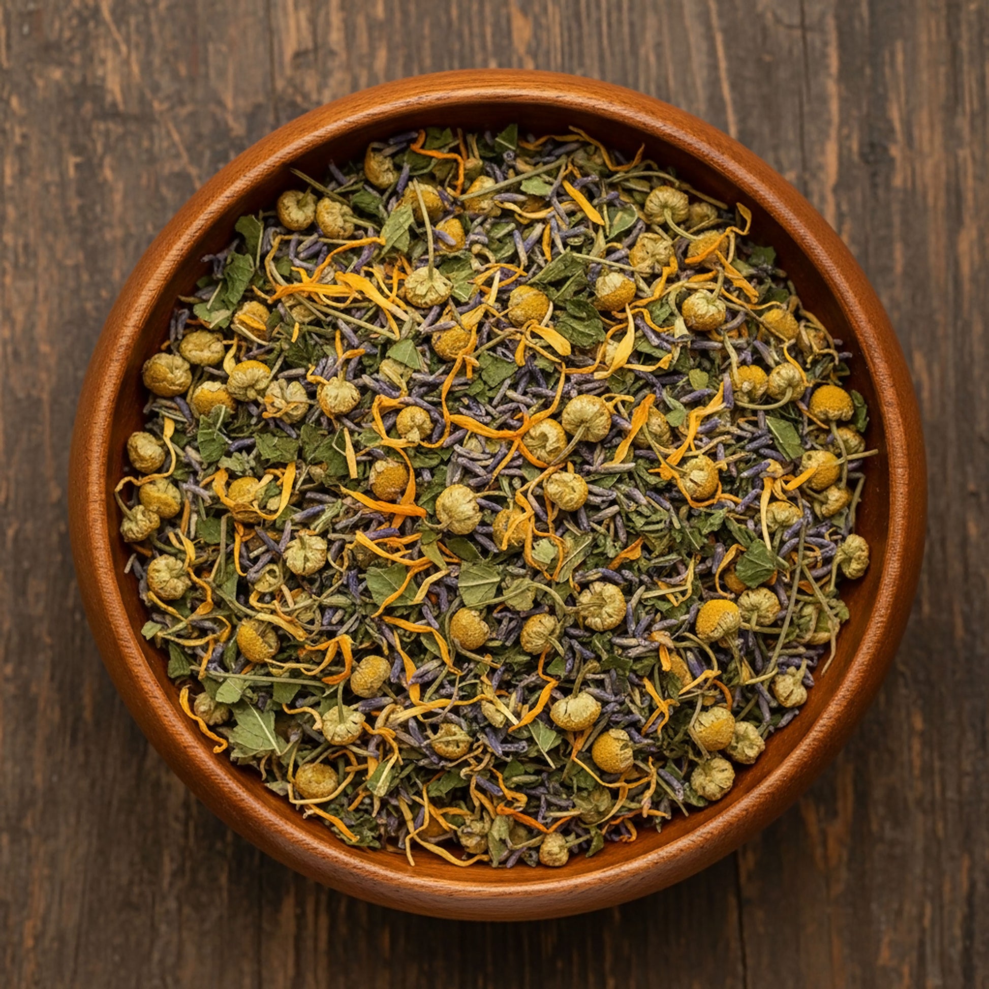 A gentle, aromatic infusion with chamomile, lemon balm, and fragrant lavender. Peppermint adds a refreshing finish, while vanilla extract lends a smooth, creamy warmth — a soothing blend for evening relaxation.